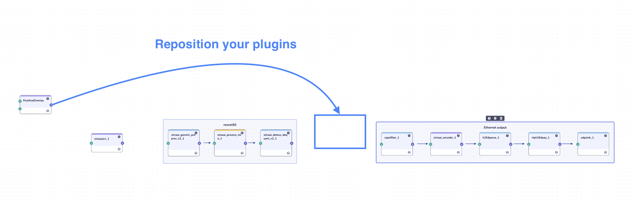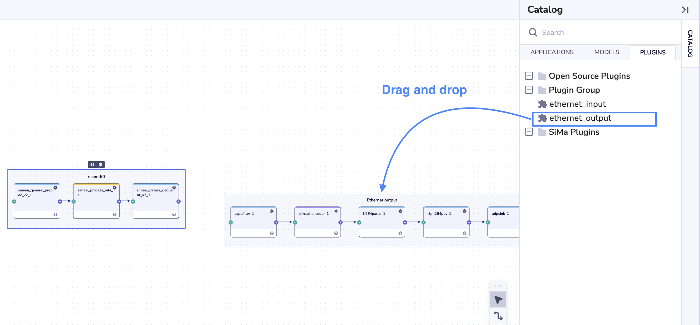 To visualize the pipeline output, we need an output plugin. The quickest option in Edgematic is to use the Ethernet Output complex group. This group of plugins, when added together, provides a rapid way to see the final processed frames or data.