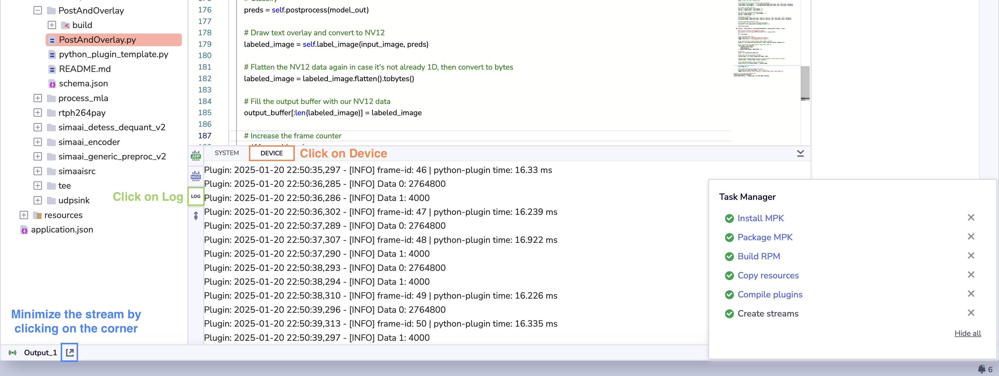 Log -> DeviceYou should see output logs similar to this:Here is an example of the classification overlay you should see on your output stream: