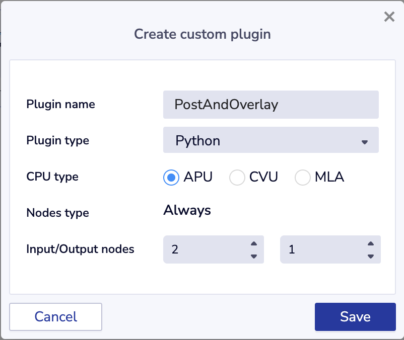 PythonforPlugin typeSince we want to overlay the classification label on top of the same input image, select two inputs for