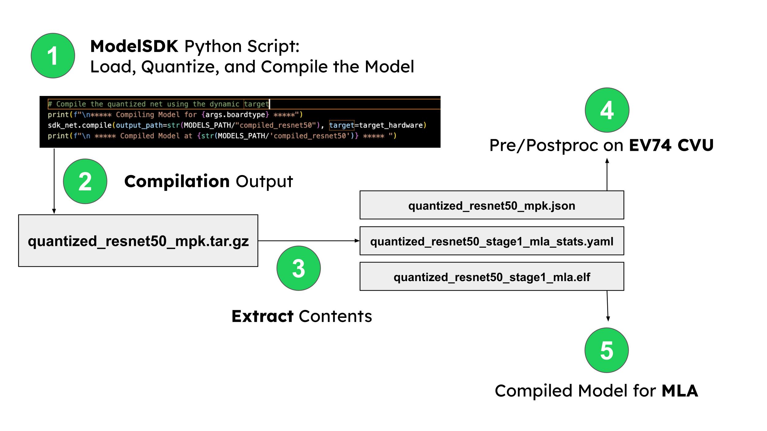 The output of a compiled model in the ModelSDK is a tar.gz model that contains the compiled model, metadata in the form of a _mpk.json file and a stats file.