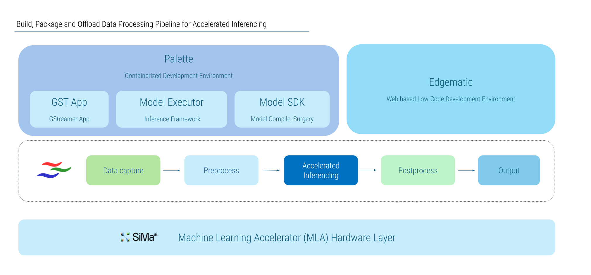 SiMa’s software development offering centers around a GStreamer pipeline that can be defined, packaged, and deployed to the SiMa MLA for accelerated inferencing.
