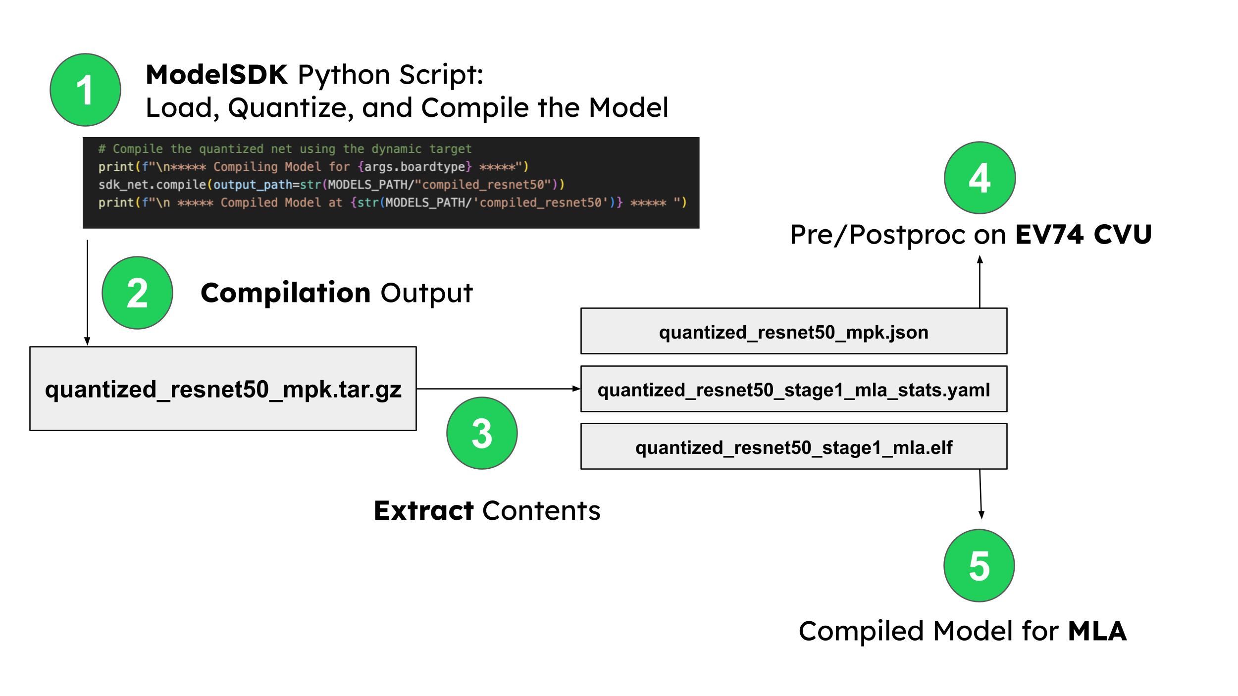 The output of a compiled model in the ModelSDK is a tar.gz model that contains the compiled model, metadata in the form of a _mpk.json file and a stats file.