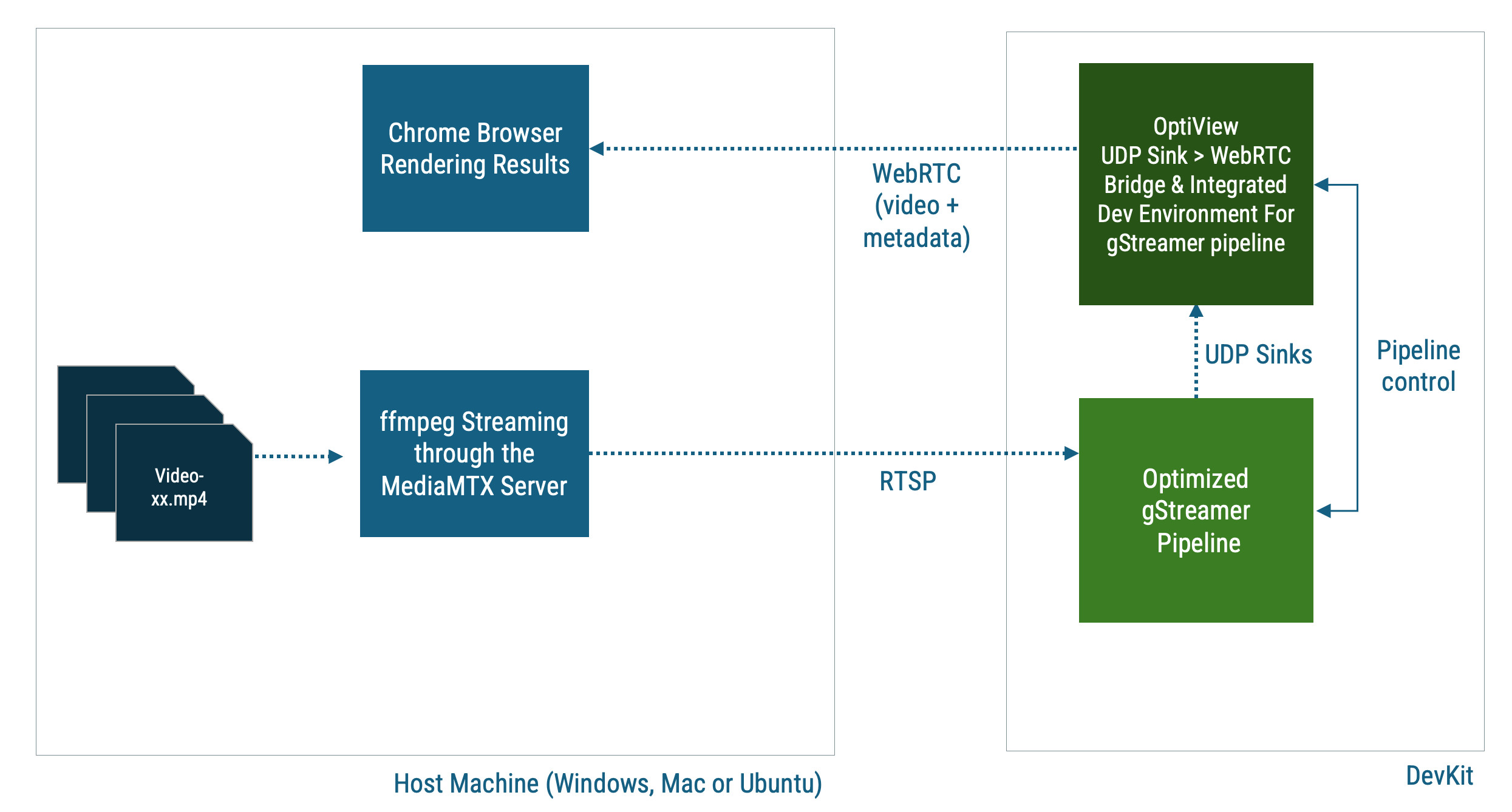 This prebuilt demo uses OptiView — a tool that streamlines Vision AI ML pipeline development. On the host side, an installable package integrates MediaMTX, an open-source media streaming server, to deliver multiple RTSP channels to the DevKit.