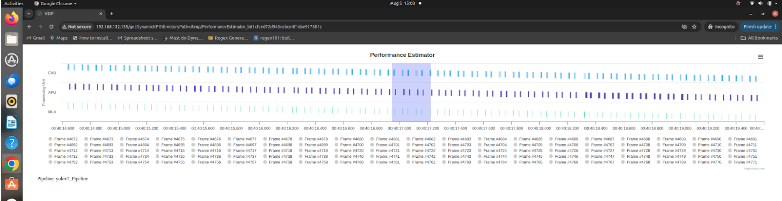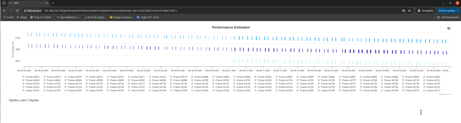 • To interpret data open a .json file from /tmp/PerformanceEstimator_* in your editor. You can view data for each frame for all three processing units (CVU, APU and MLA) and the plugins that are executed to compute on that processing unit.